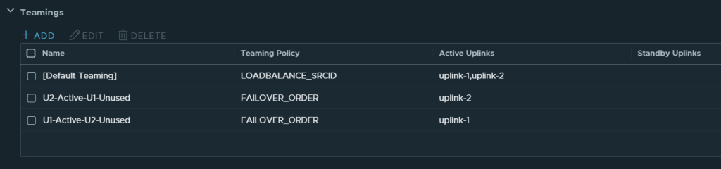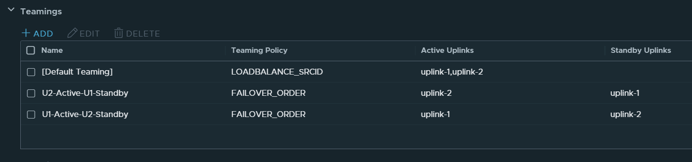 I recommend using meaningful names for the Teamings so that you can easily see on the Segments what policy will be used. Note that the opposite uplink is Standby for each Active uplink.