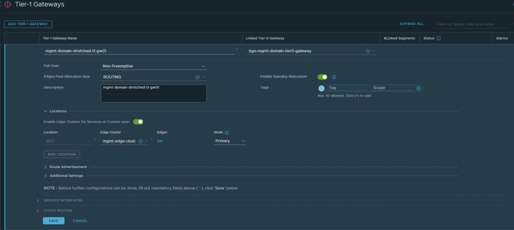 28. Deleted VCF Instance 1 (BGO) as a Location for this Tier-1 Gateway since this is a local only Tier-1 Gateway.