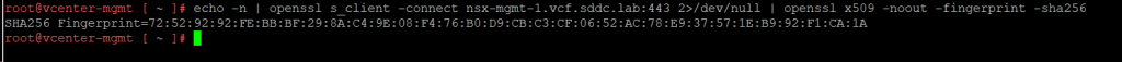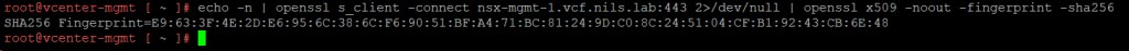 echo -n | openssl s_client -connect nsx-mgmt-1.vcf.sddc.lab:443 2>/dev/null | openssl x509 -noout -fingerprint -sha256