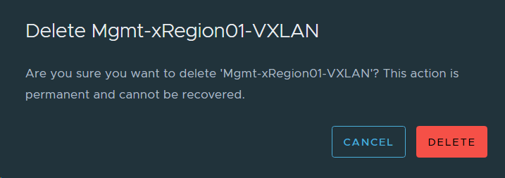 15. Deleted the existing Cross-Region Segment from the NSX-T Manager in VCF Instance 2 (OSL) since we will stretch the one deployed in VCF Instance 1 (BGO). The name in the image below contains “VXLAN”, but this name has stuck in the lab since VCF 3.x where NSX-V was used. It is in fact a regular NSX-T Overlay Segment.