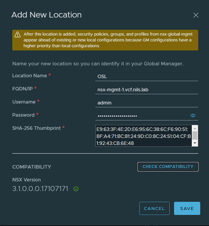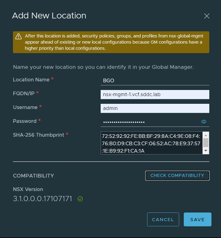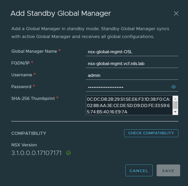 First step was to retreive the SHA-256 thumbprint of the NSX-T Global Manager certificate in VCF Instance 2 (OSL) using this command from the vCenter Server: