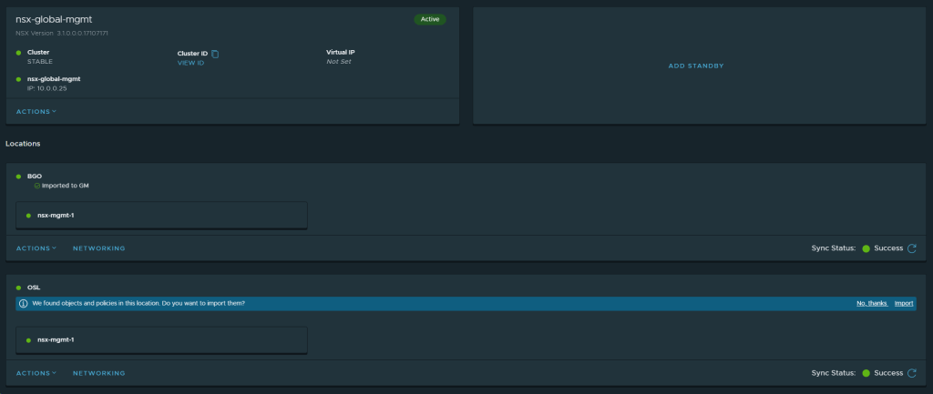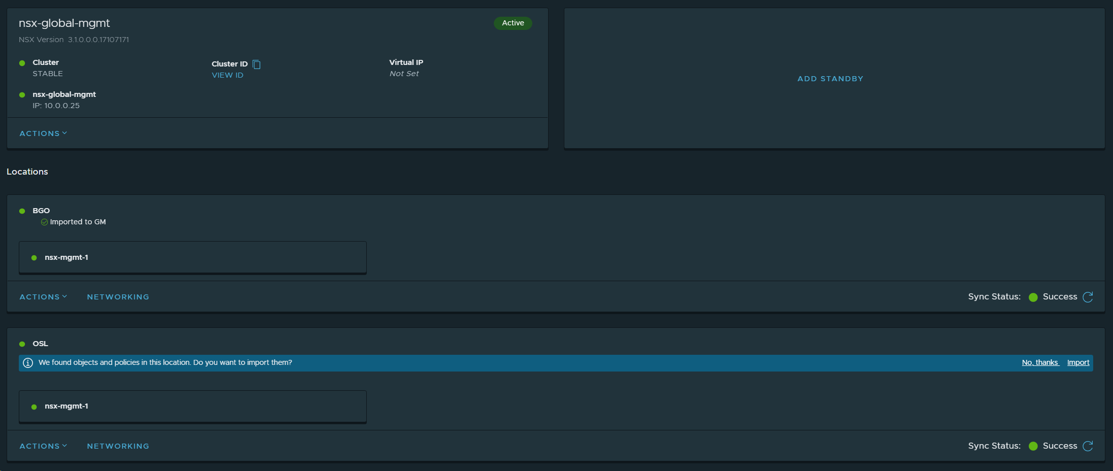 Then I added the NSX-T Global Manager in VCF Instance 2 (OSL) as standby.