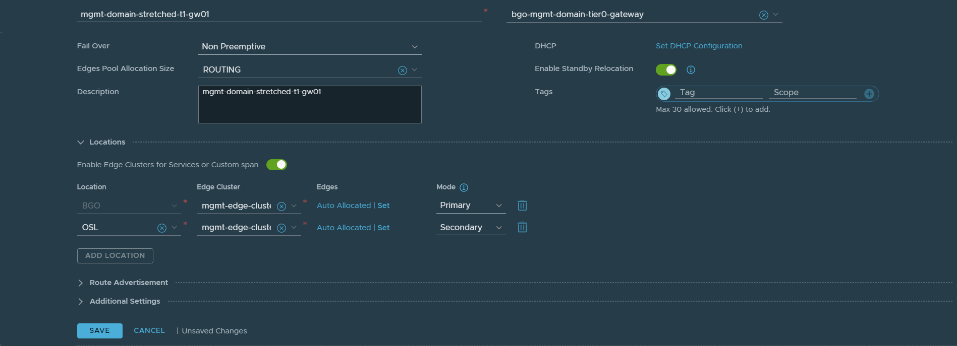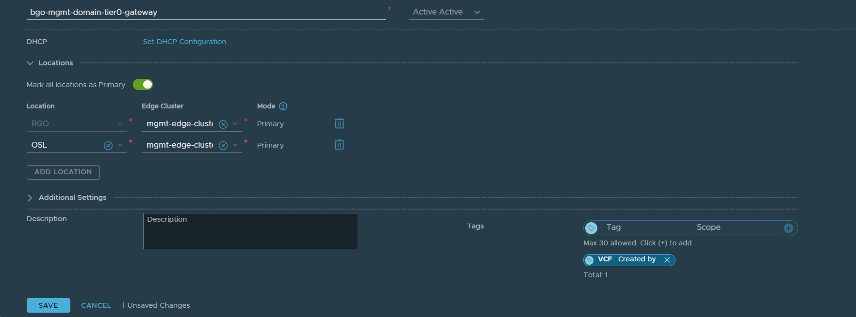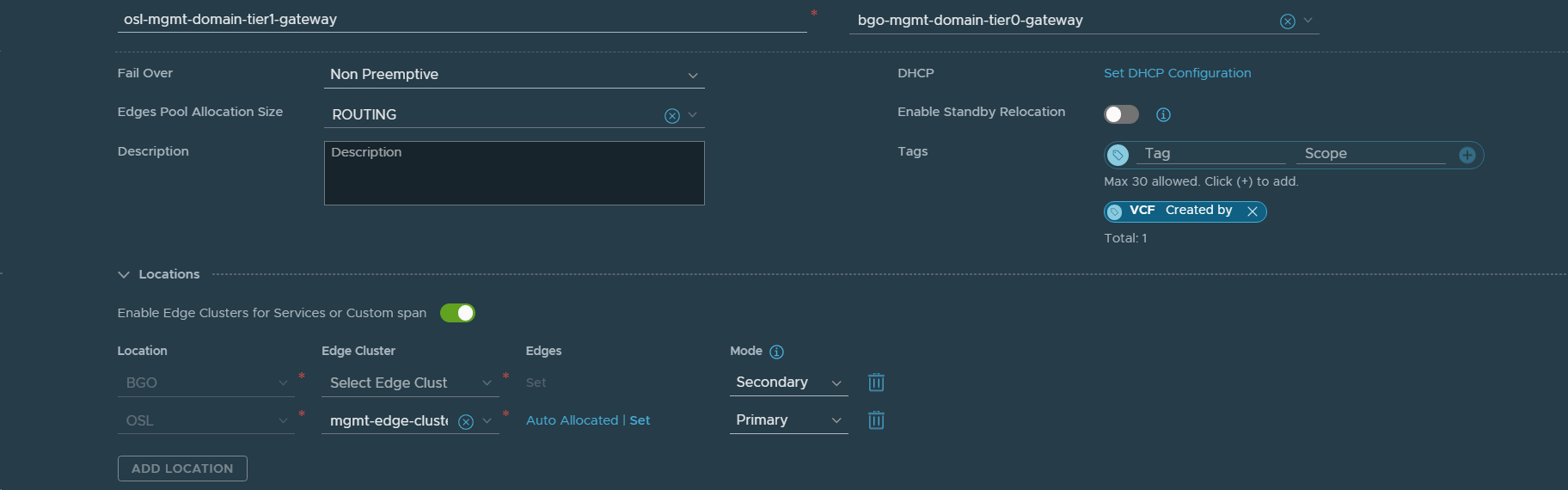20. Reconfigured the Tier-0 Gateway in VCF Instance 1 (BGO) to stretch the network between VCF Instance 1 (BGO) and VCF Instance 2 (OSL). Added OSL as a Location to existing bgo-mgmt-domain-tier0-gateway.