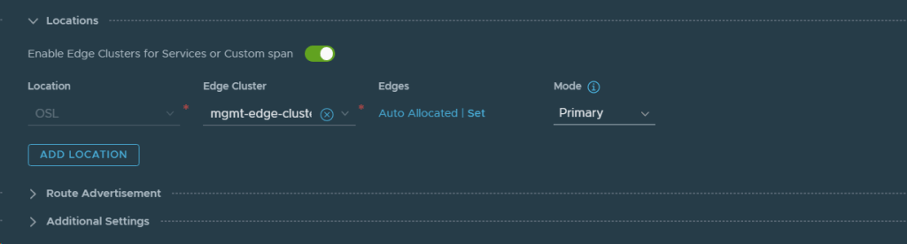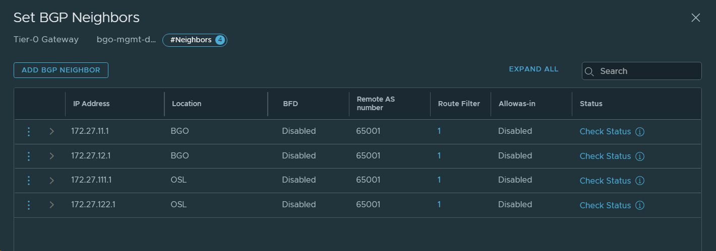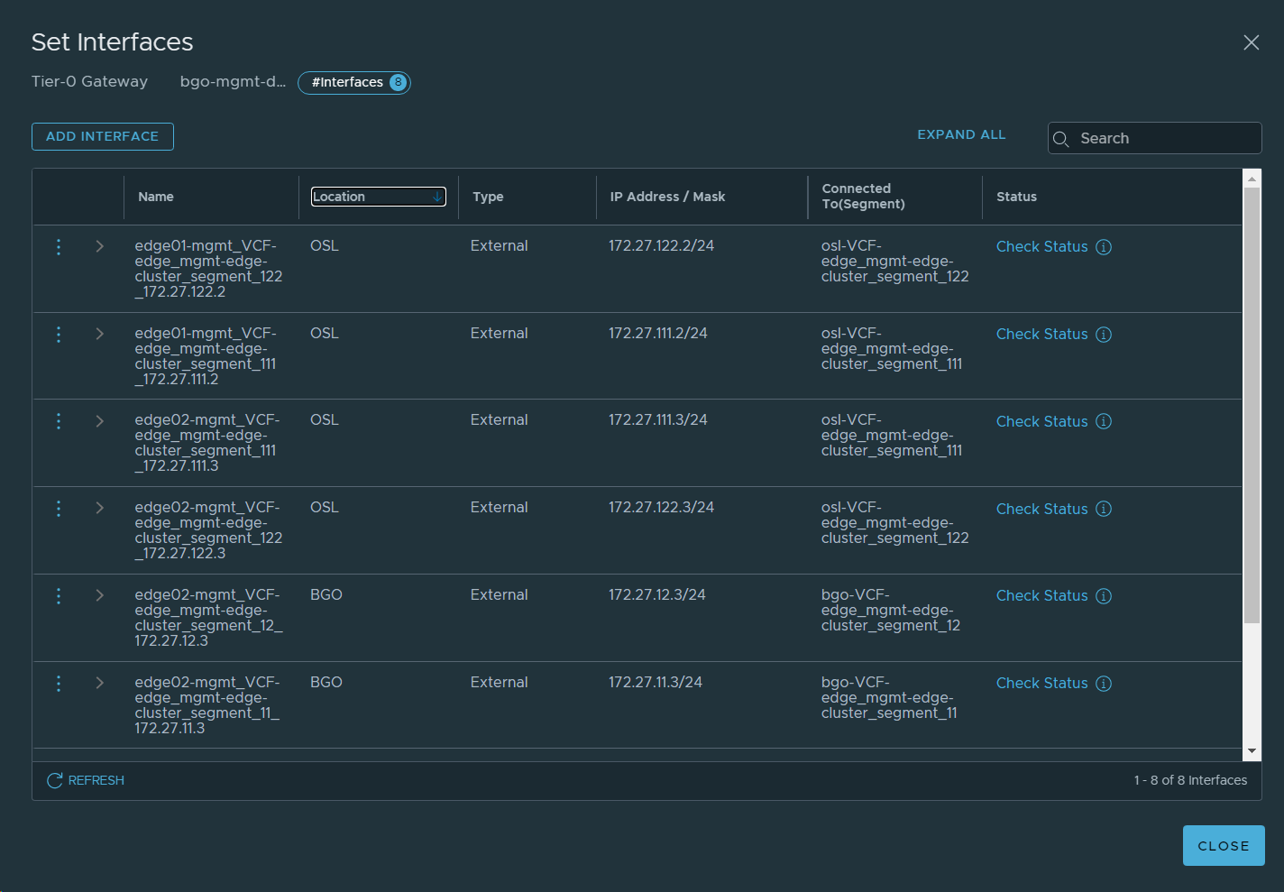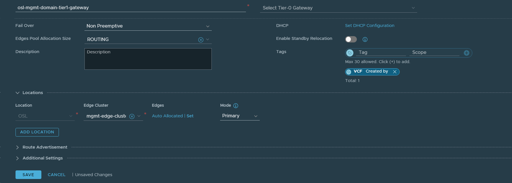 20. Reconfigured the Tier-0 Gateway in VCF Instance 1 (BGO) to stretch the network between VCF Instance 1 (BGO) and VCF Instance 2 (OSL). Added OSL as a Location to existing bgo-mgmt-domain-tier0-gateway.