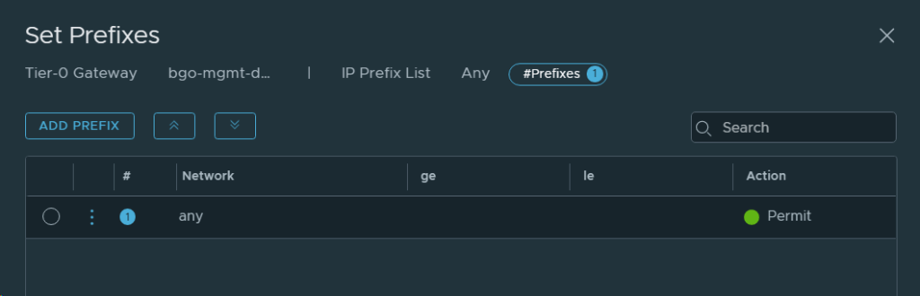 23. Configured an Any IP Prefix in the Tier-0 Gateway.