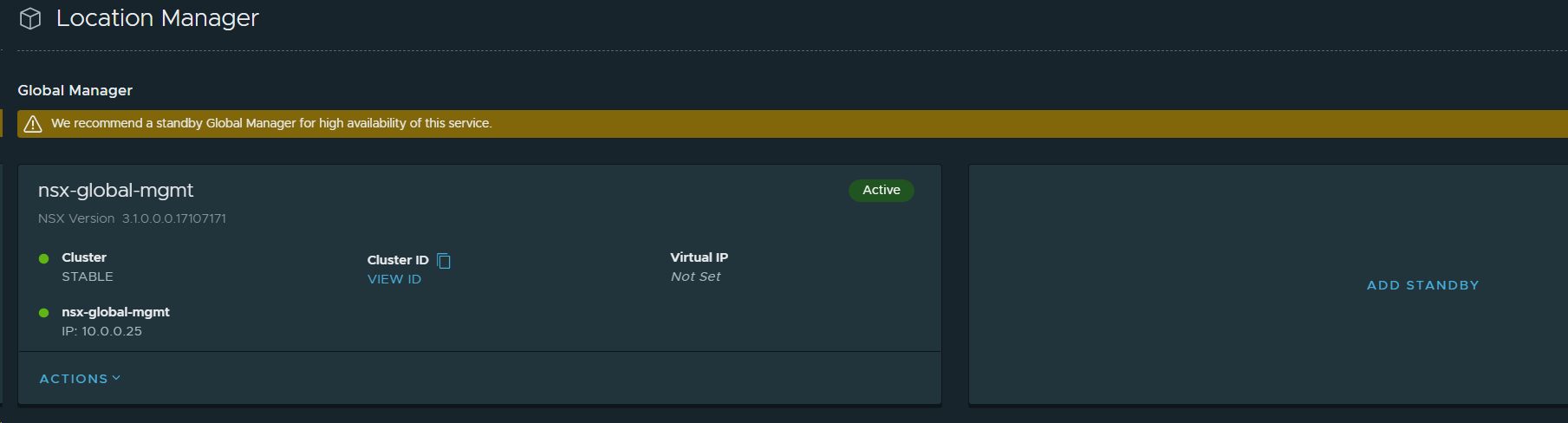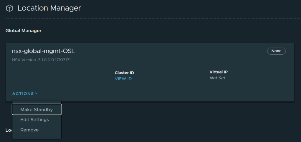 30. Set the NSX-T Global Manager in VCF Instance 2 (OSL) as Standby for the NSX-T Global Manager in VCF Instance 1 (BGO). This provides high availability of the active NSX-T Global Manager.