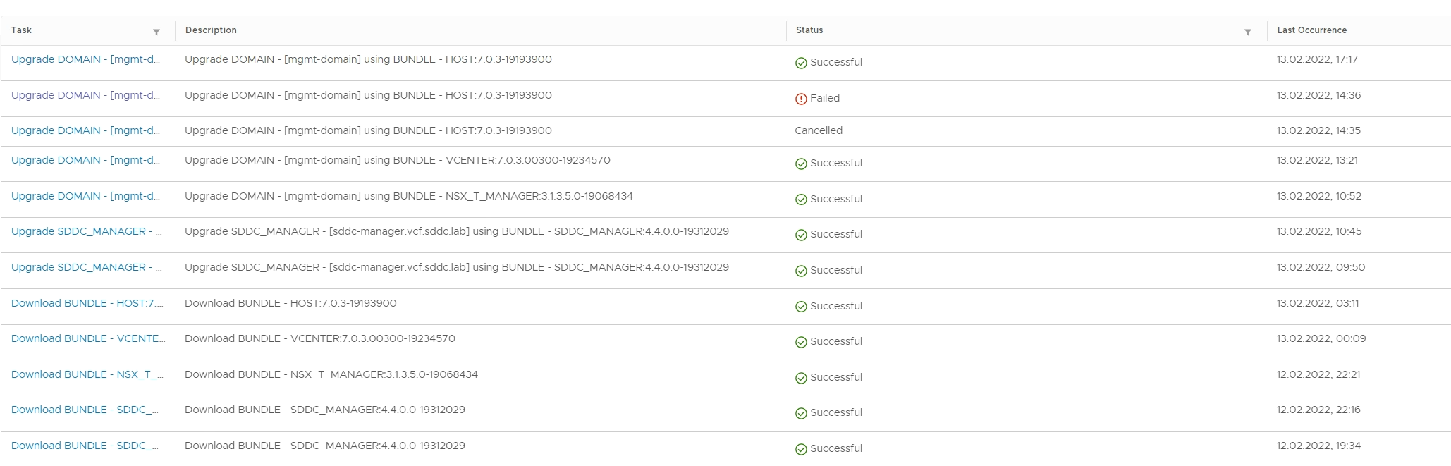 I downloaded and installed all the update bundles in the order dictated by SDDC Manager, and everything went well except for the first ESXi host upgrade:
