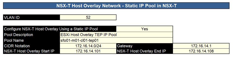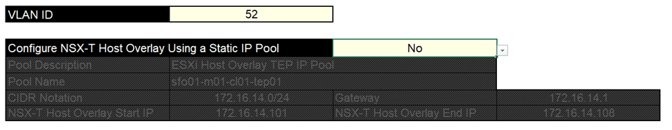 When deploying VMware Cloud Foundation (VCF) one can choose between configuring NSX-T Host Overlay using a static IP Pool or DHCP. This is specified in the vcf-ems-deployment-parameter spreadsheet which is used by the Cloud Builder appliance to bring up the Management Workload Domain as you can see in the following images: