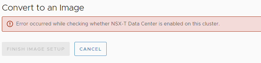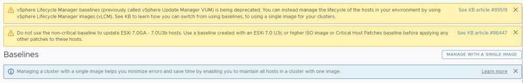 The vCenter upgrade completed successfully without any problems so I moved on to upgrading the ESXi hosts. Since vSphere Lifecycle Manager using Baselines is deprecated I wanted to change to using it with Images, meaning using a single image to manage all hosts in the cluster. A cluster in Baselines mode can be converted into a cluster in Images mode, so that is what I did.