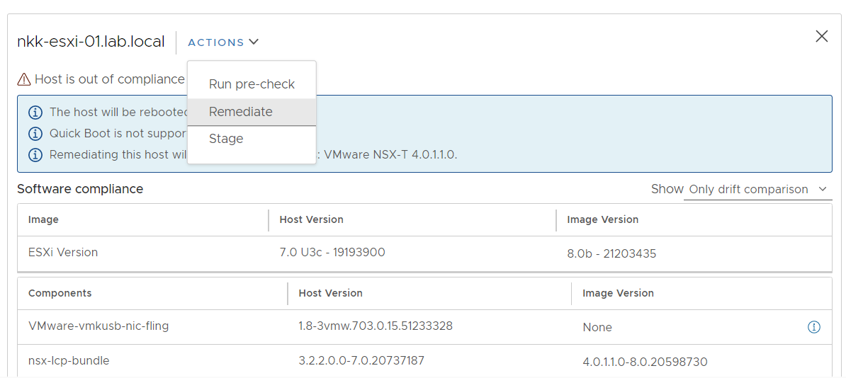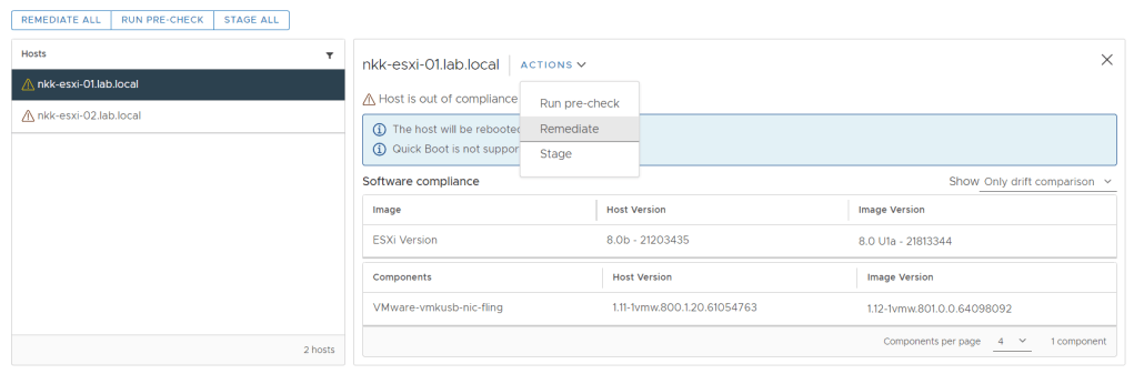 I have also selected to only remediate the host named nkk-esxi-01 first and not the entire cluster. This way I can validate that the image works for my hosts before upgrading all of them. It is a common misunderstanding that this is not possible when managing the cluster with a single image.