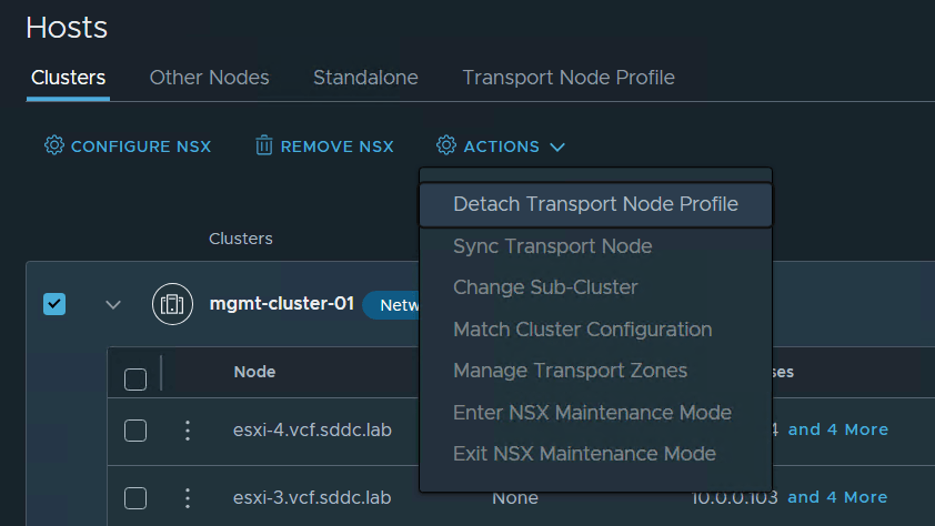 I then selected the cluster again and chose Detach Transport Node Profile from the Actions menu so that it is back to the initial state.