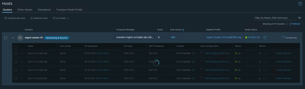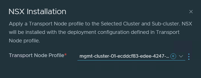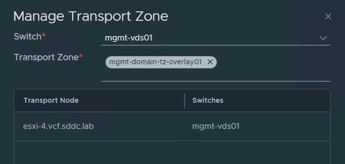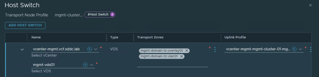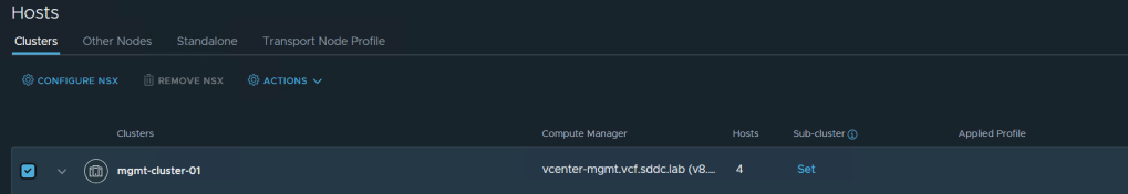 When using a Baseline based Workload Domain (WLD) the TNP is detached from the cluster. This would always be the case with the Management WLD. This means that when you have added the VLAN Transport Zone to the TNP, it needs to be attached to the cluster so that the Transport Zone can be added to the hosts. Then you should detach the TNP from the cluster again. If you have an Images based WLD, the TNP should already be attached to the cluster and you should leave it like that. The screenshots below are from my Management WLD which is Baseline based. Note that there is nothing listed under Applied Profile.