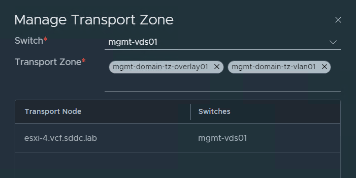 Checking the configuration on one of the ESXi hosts shows that the VLAN Transport Zone was added successfully.