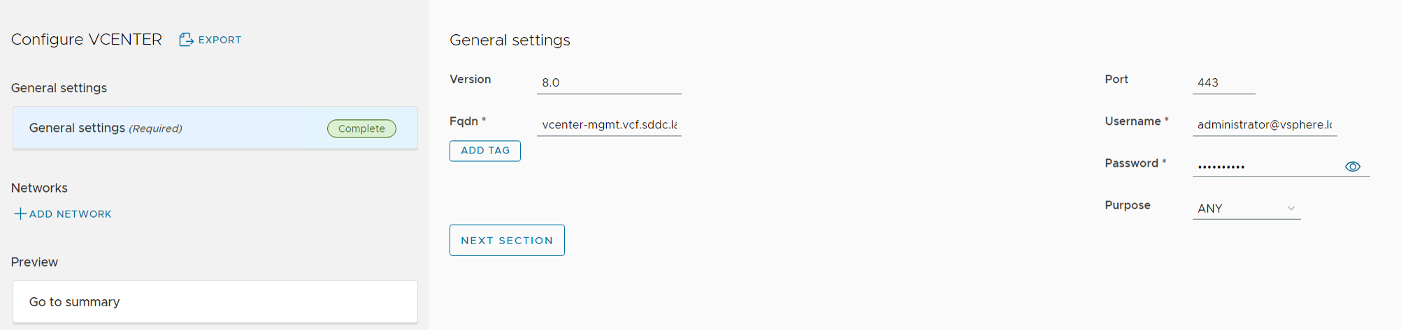 Cloud Provider Lifecycle Manager must be downloaded as an OVF file from VMware and deployed in vSphere. There is not much to be configured during the deployment, but I chose to connect it to my Region-A segment which is one of the Application Virtual Networks that VCF deploys. Most of the settings are self-explanatory but when asked to provide “NFS share to mount as VCP LCM repository” you may choose to leave it blank and it will use a local directory on the appliance instead. This is ok for lab purposes but not in a production environment.