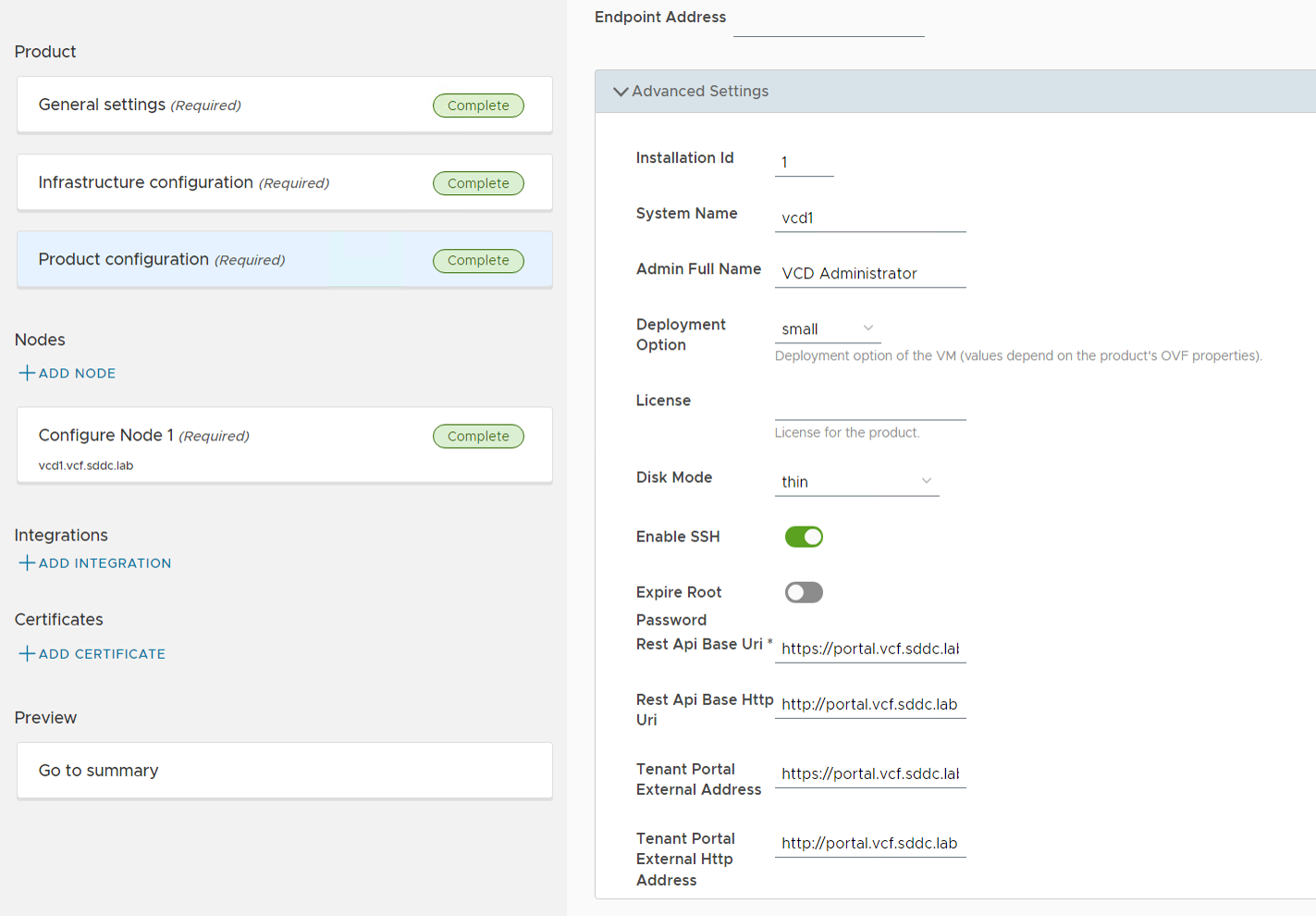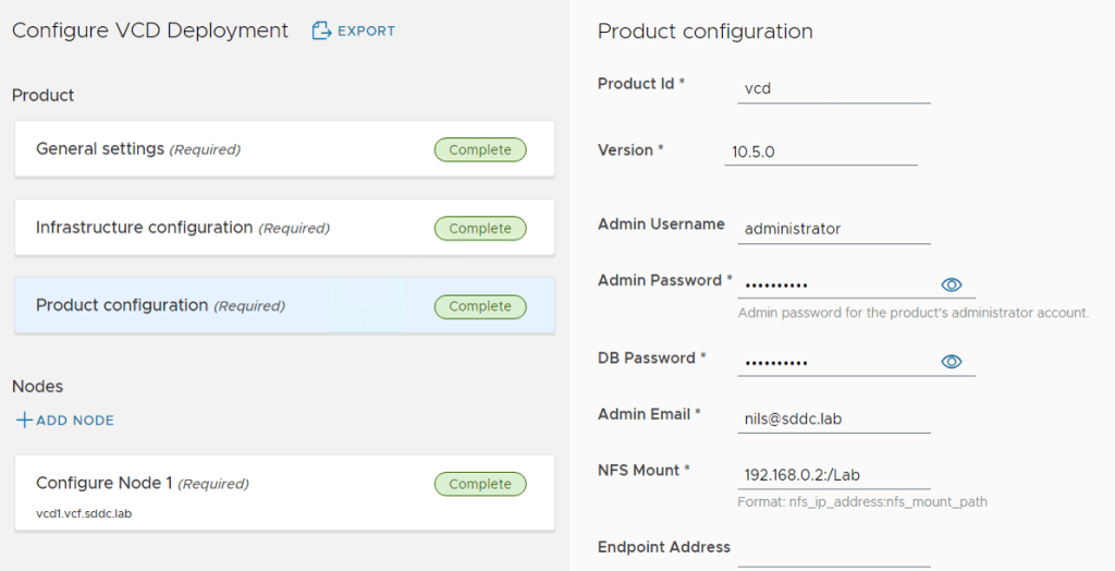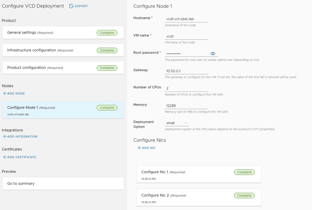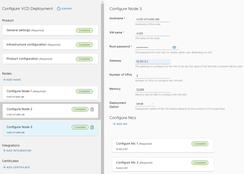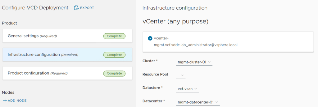 The Product Deploy Step failed after it had deployed the first VCD appliance, but I was able to log in to the appliance and check the /opt/vmware/var/log/firstboot log file and found that the appliance was unable to resolve itself in DNS. Nslookup worked fine from the appliance, and after some troubleshooting I found that it requires to resolve DNS records using TCP and not only using UDP. The command nslookup -vc vcd1.vcf.sddc.lab confirmed that it could not resolve using TCP, and after fixing my DNS server to support TCP, I did another try and this time the deployment succeeded: