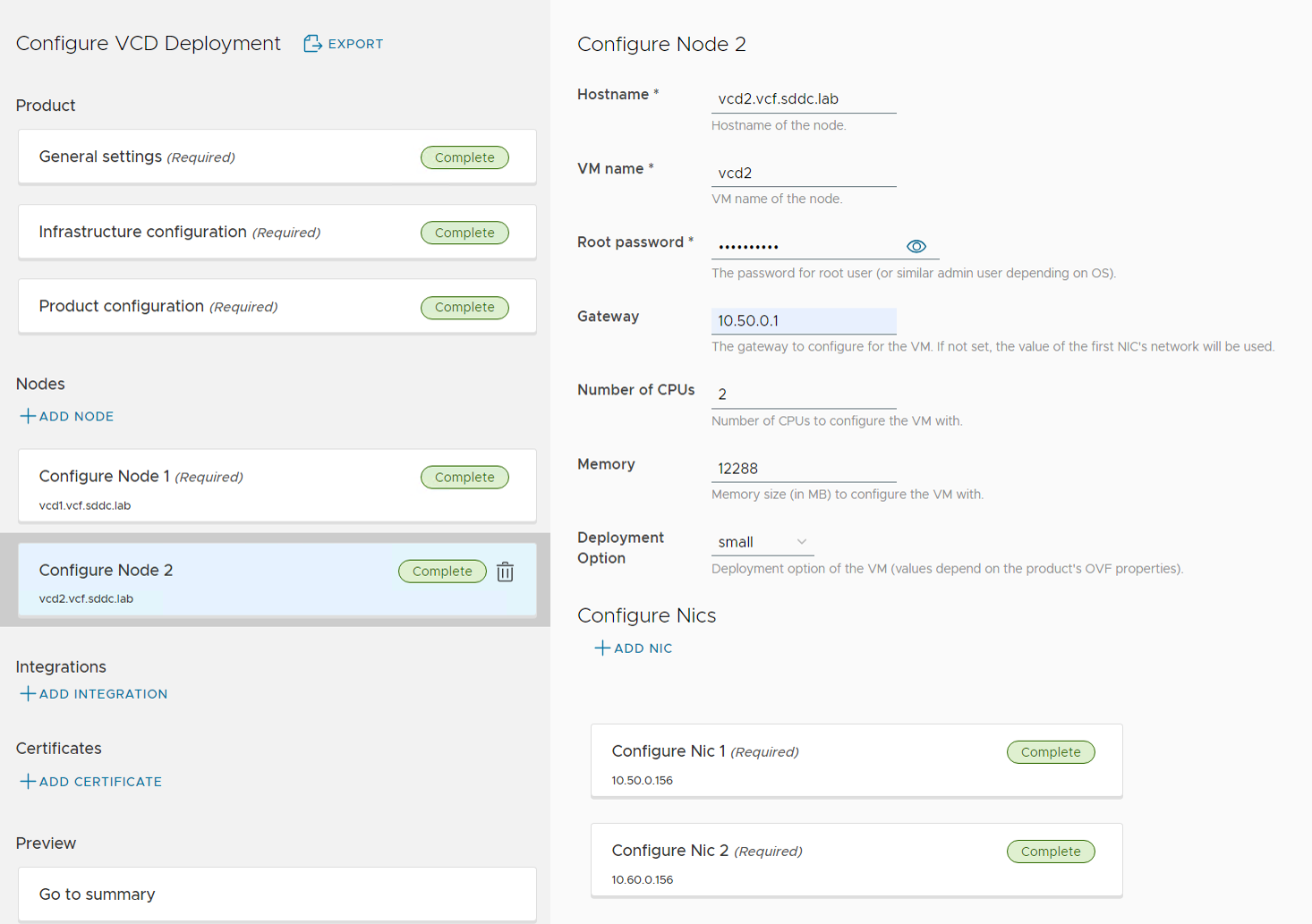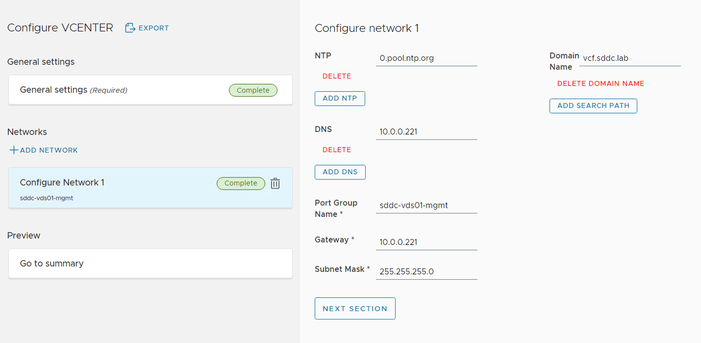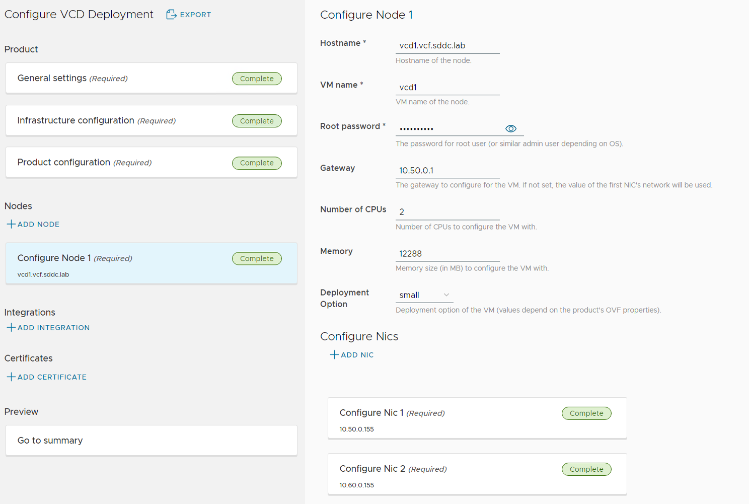 The Product Deploy Step failed after it had deployed the first VCD appliance, but I was able to log in to the appliance and check the /opt/vmware/var/log/firstboot log file and found that the appliance was unable to resolve itself in DNS. Nslookup worked fine from the appliance, and after some troubleshooting I found that it requires to resolve DNS records using TCP and not only using UDP. The command nslookup -vc vcd1.vcf.sddc.lab confirmed that it could not resolve using TCP, and after fixing my DNS server to support TCP, I did another try and this time the deployment succeeded:
