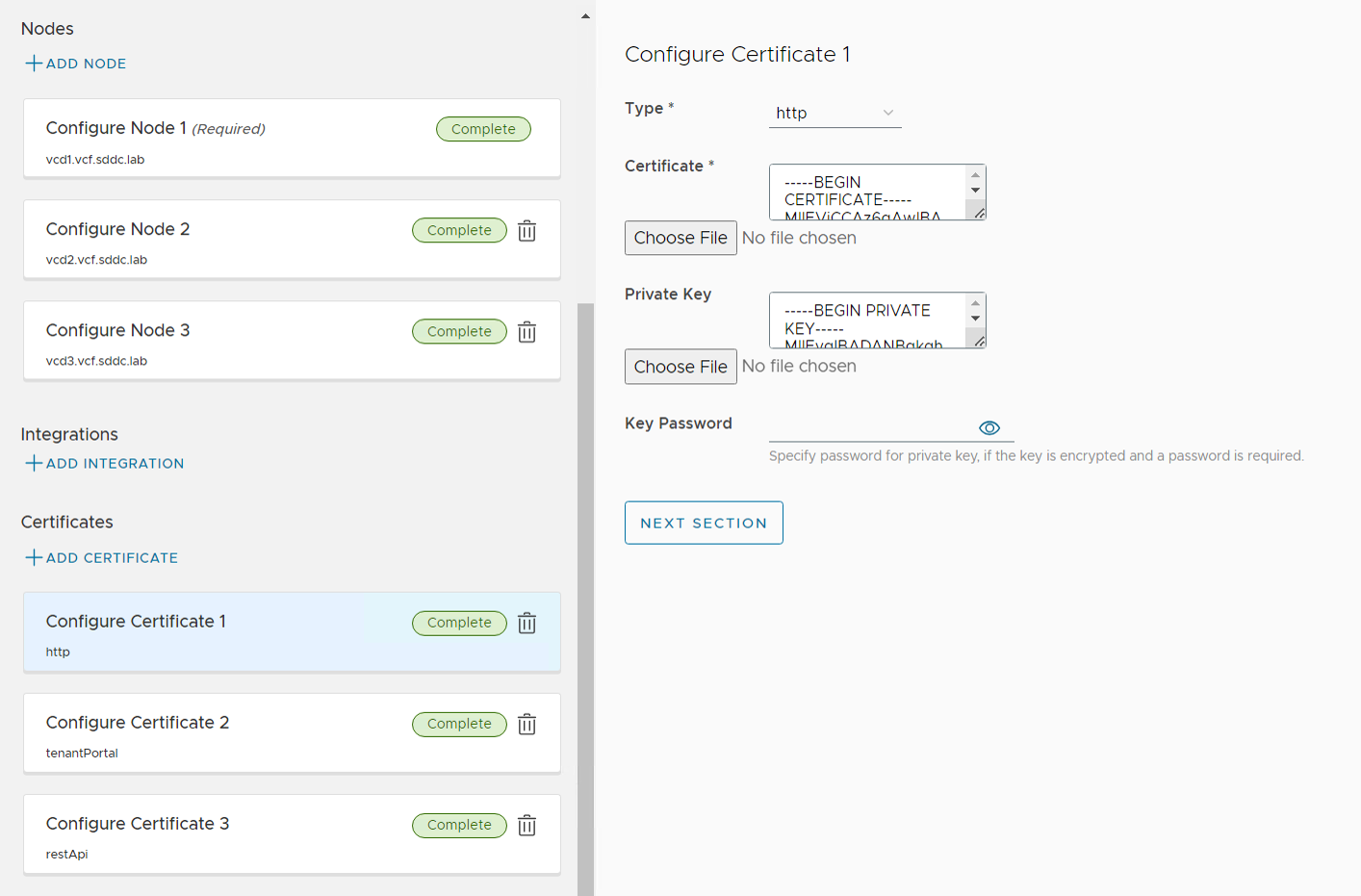 One single SSL certificate was created using https://certificatetools.com/, imported into NSX-T Manager, added to the LB, and used when deploying VCD.