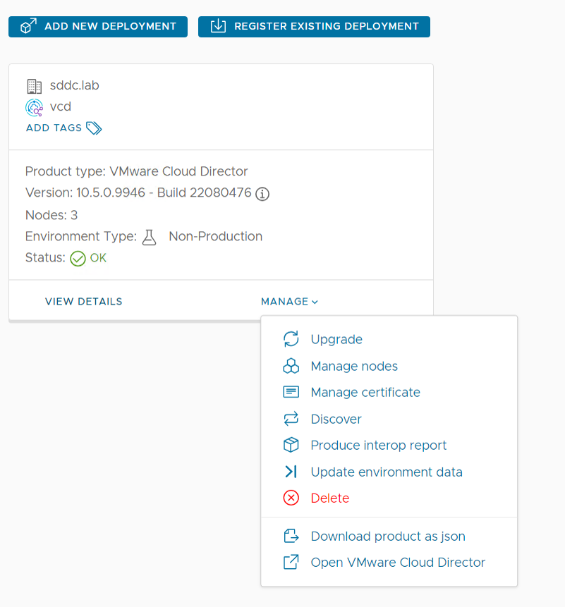 - Deploy VMware Cloud Director, VMware Chargeback, RabbitMQ, and vCloud Usage Meter using manual input or a json file.