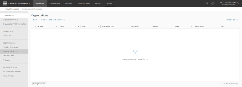 Since I didn’t have any Organizations configured yet I went to https://portal.vcf.sddc.lab/provider and logged in with Administrator to see if everything looked good:
