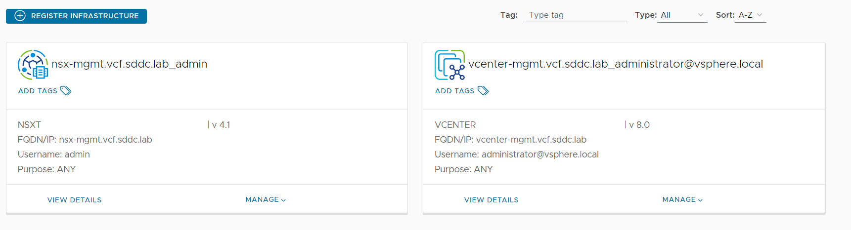 I logged in to the user interface at https://cloud-lcm.vcf.sddc.lab/ using the vcplcm user, then registered my vCenter and NSX-T Manager under the Infrastructures tab:
