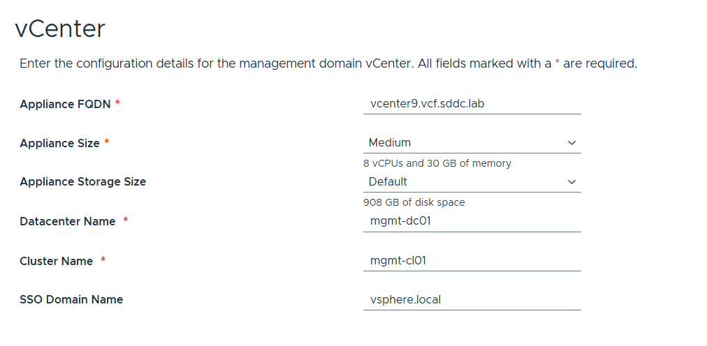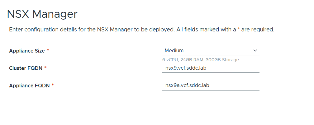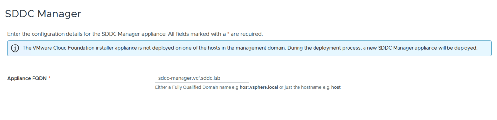 All that is needed for SDDC Manager is the FQDN. Note that it is possible to turn the VCF Installer appliance into the SDDC Manager appliance during the deployment. I wanted them to be two separate appliances since I will probably use the VCF Installer many times.