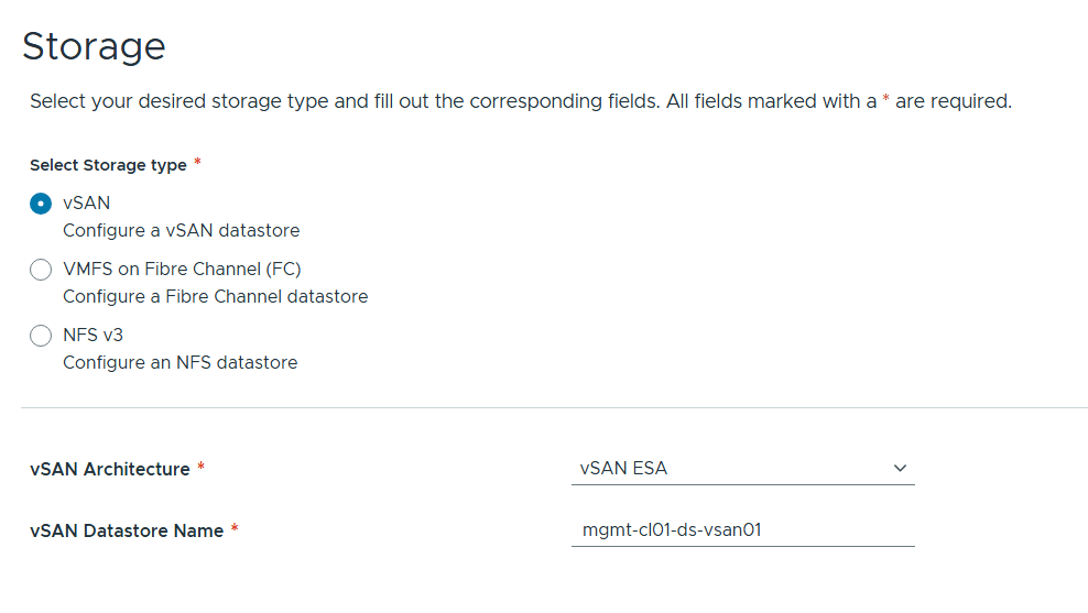 You have three options for Storage as pictured above. I chose vSAN ESA as that is the new improved standard for vSAN that I want to get more experience with.
