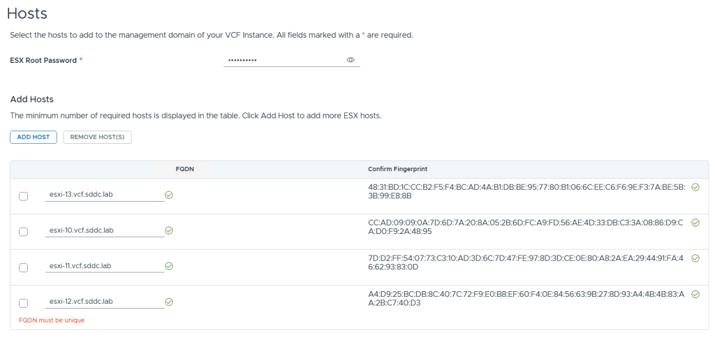 Adding ESX hosts is straight forward. Simply provide the root password, FQDNs and confirm the fingerprints (if they match your hosts :-).