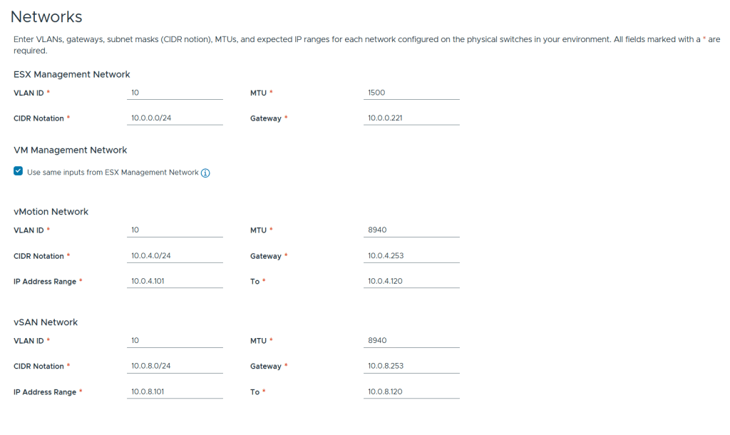 There is nothing new regarding networks configuration. I chose to use the same VLAN ID for all the networks for simplicity in my lab but in a production deployment these should be unique. I use 8940 MTU for vMotion and vSAN since this is a nested lab. The VDS use the standard 9000 MTU.