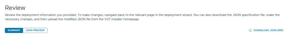 We are then presented with a Review screen where we get a summary of the configuration, the option to see a json preview and also the option to download the json spec as a file. This file can be edited and imported into the VCF Installer again for another deployment. Another nice detail about the VCF Installer is that you can close it at any time during the configuration process and it will let you save the progress so that you can continue at a later time.