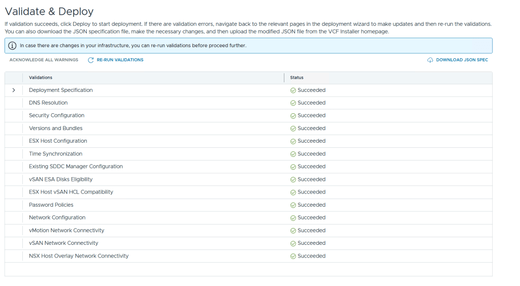 Before you can start the deployment you must run a validation. If the validation detects any errors you will have to resolve those before it allows you to deploy, but any warnings can be acknowledged so that you may still start the deployment. Lucky for me I didn’t get any warnings or errors.