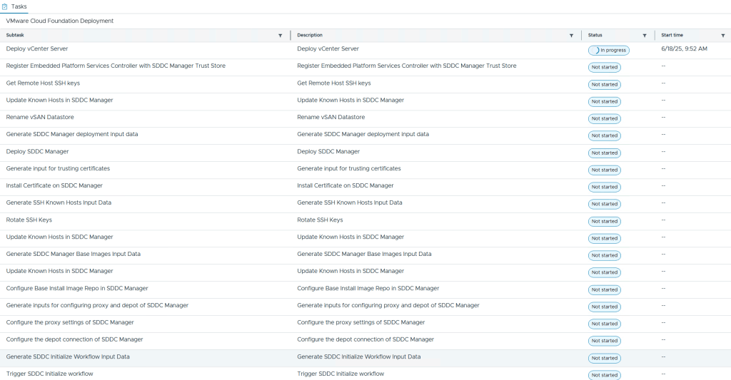 During the deployment you are able to see each subtask with their status. I also recommend that you follow the domainmanager.log file on the VCF Installer appliance so you can spot and fix problems before they cause the VCF Installer to time out with an error message. My deployment failed once after it deployed VCF Automation due to running out of disk space. After freeing up disk space I could choose to retry the deployment and it started again at the point where it failed and didn’t need to start from the beginning. Note that it was my local datastore hosting the nested ESX hosts that ran out of disk space so 300 GB was enough for each nested ESX host. The vSAN ESA datastore consumed less than 50% after the deployment.