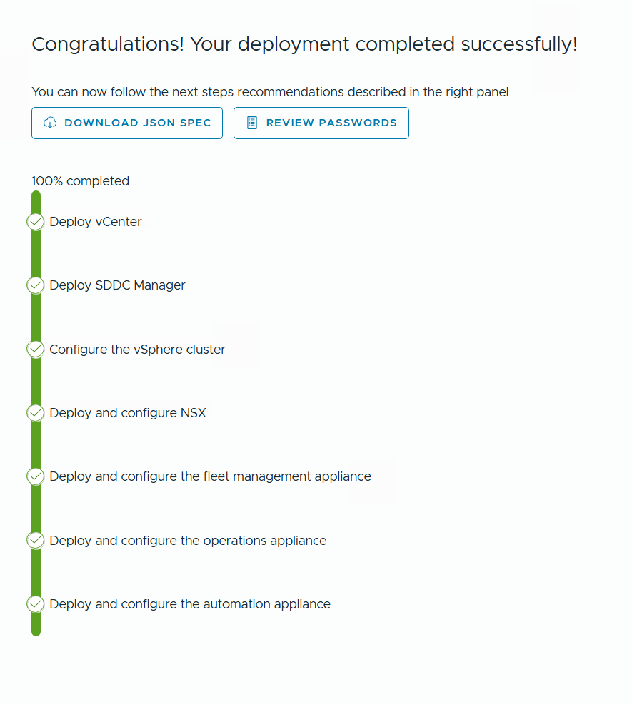 After a few hours I was presented with this happy message and by clicking on Review Passwords I could see how to log into my brand new VCF 9 lab.