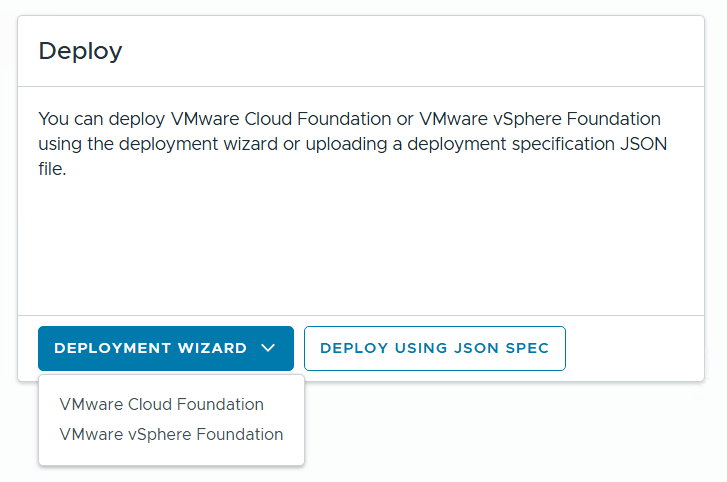 The installer lets you choose between Deploying VMware Cloud Foundation or VMware vSphere Foundation, and you can decide if you want to use a deployment wizard where you are guided through all the input parameters in the user interface or deploy using a json file. I chose to deploy VCF using the wizard this time.