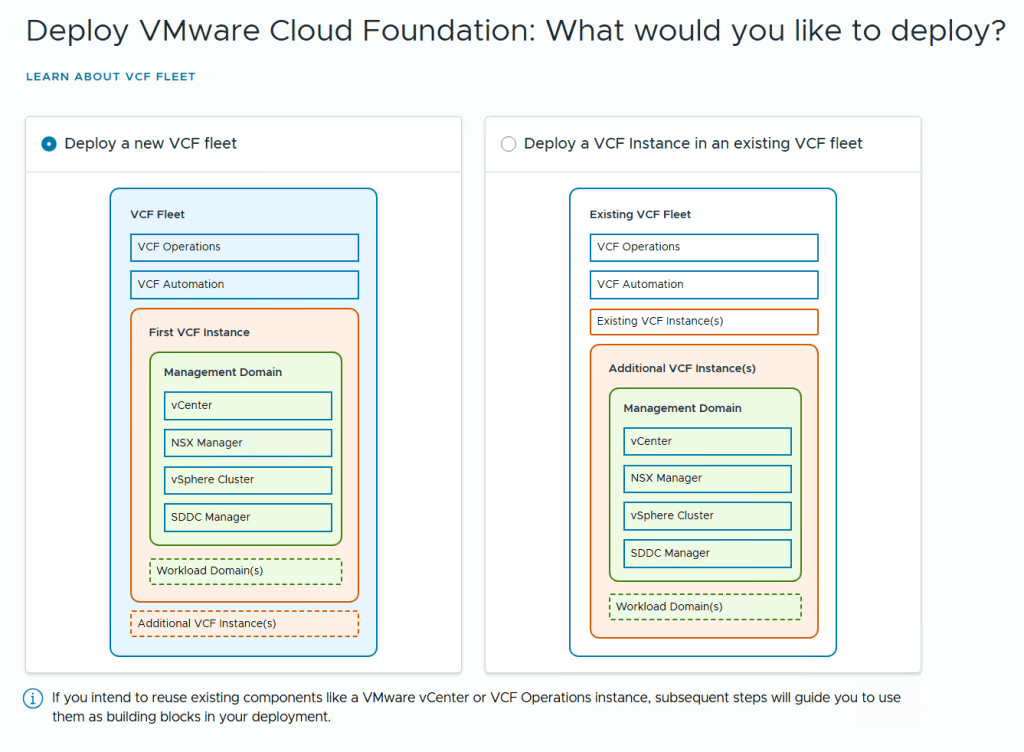 The next step lets you choose between deploying a new VCF Fleet or a new VCF Instance in an existing VCF Fleet. Since I don’t have an existing fleet I chose to deploy a new fleet. The fleet concept is new in VCF 9 and you can read more about it here: