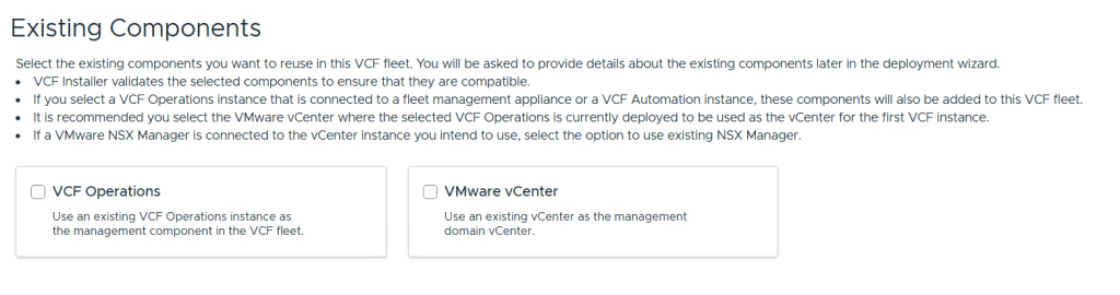 We are then able to point to existing VCF Operations and vCenter instances to use in this fleet. I didn’t select any of them since I wanted to deploy brand new ones.