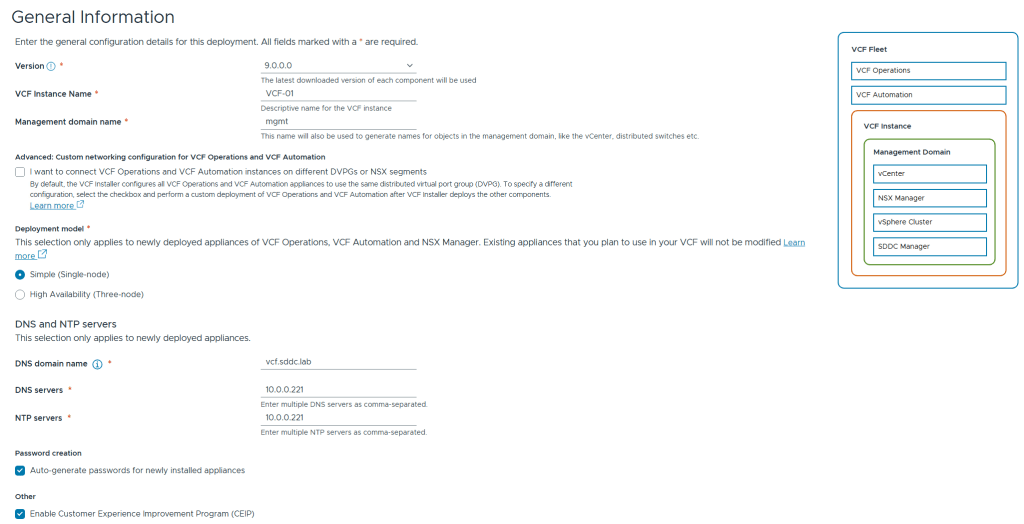 We are then presented with the following screen asking for general information. To save on resources I chose the Simple deployment model which deploys a single node of each appliance instead of three nodes for high availability. I also chose to have all the passwords auto-generated. These are presented in the user interface at the end of the deployment including user names and FQDNs for each product in VCF 9.