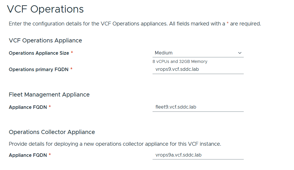 VCP Operations is mandatory in VCF 9, and so is also the Fleet Management Appliance which is based on Aria Suite Lifecycle but with more features. You also have to deploy an Operations Collector Appliance. Note that you don’t have to provide any IP addresses as they are populated by looking up from DNS so make sure those are present and correct, both forward and reverse records.