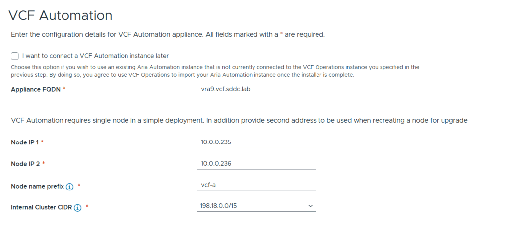 Next up is VCF Automation configuration which has the option to be skipped and connected later. I chose to deploy it now since I wanted a proper private cloud as fast as possible 🙂