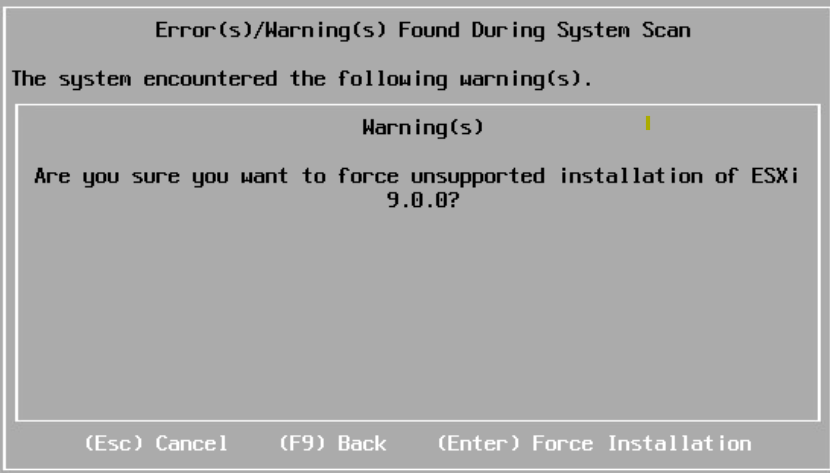 I started with deploying 4 nested ESXi 8 hosts with 24 vCPUs, 128 GB RAM and a 300 GB NVMe disk each. Note that 24 vCPUs are required to run VCF Automation, and while you can get a VCF 9 lab running without it you will miss out on a lot of private cloud functionality. The hosts were then upgraded to ESX 9 by booting on the iso. It complained about my CPU being unsupported but I could choose to force it to upgrade and I have not noticed any issues so far.