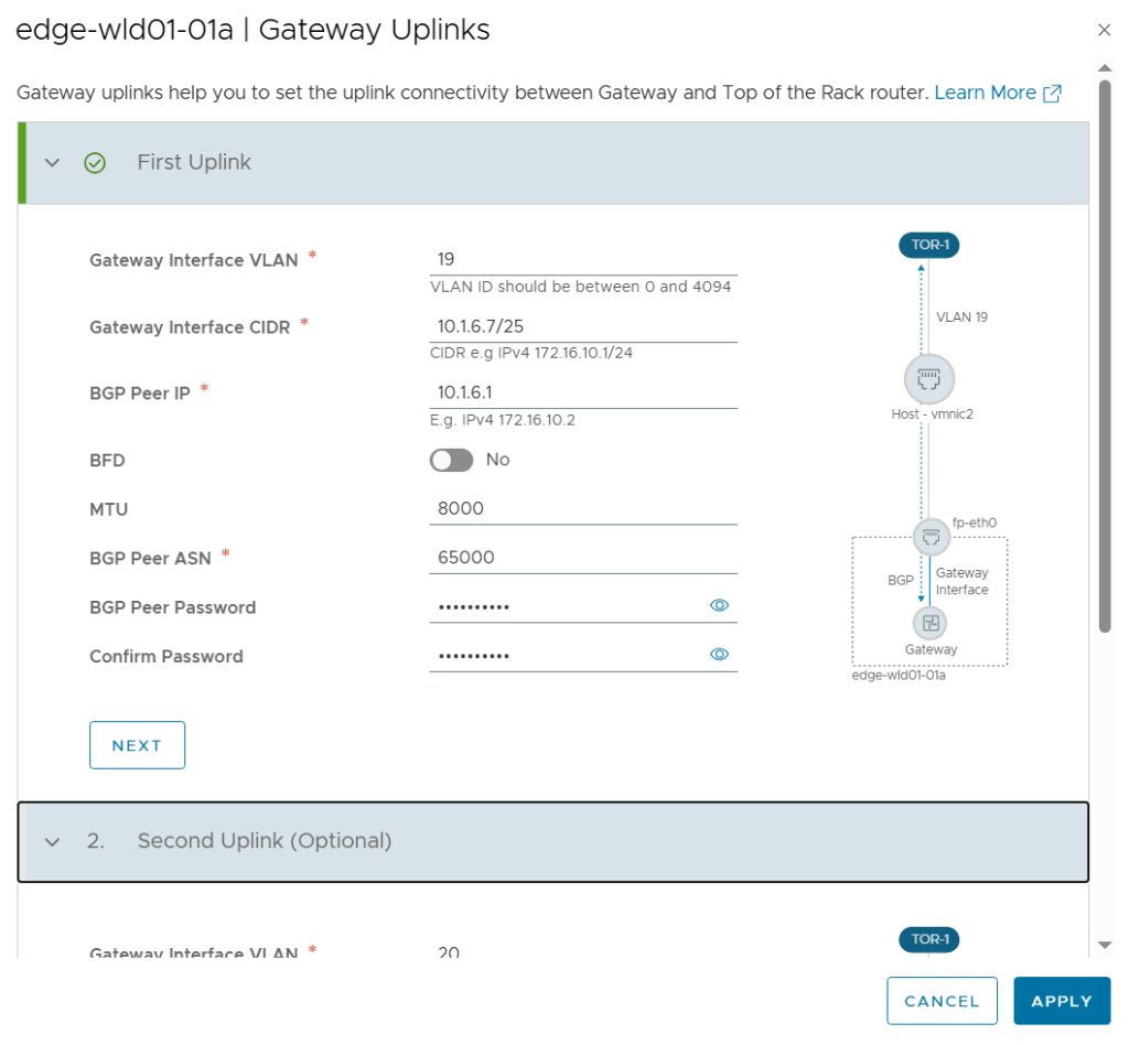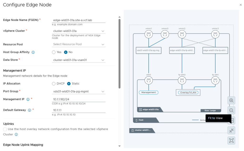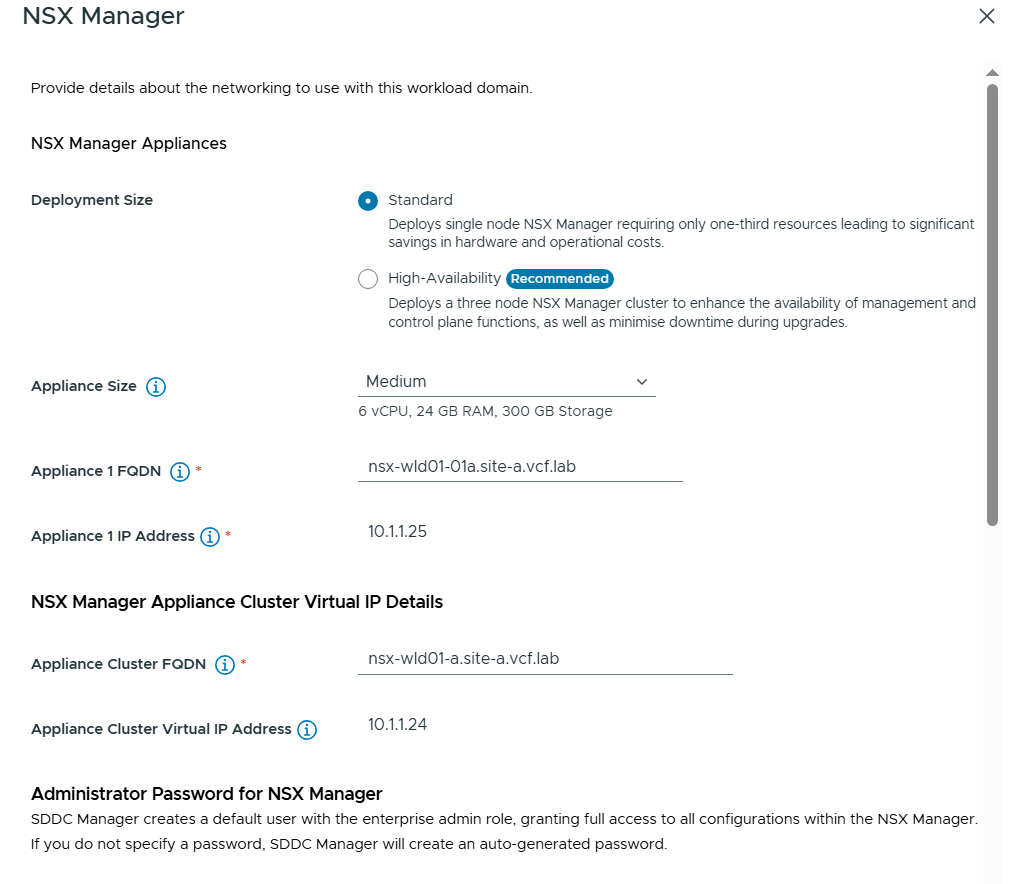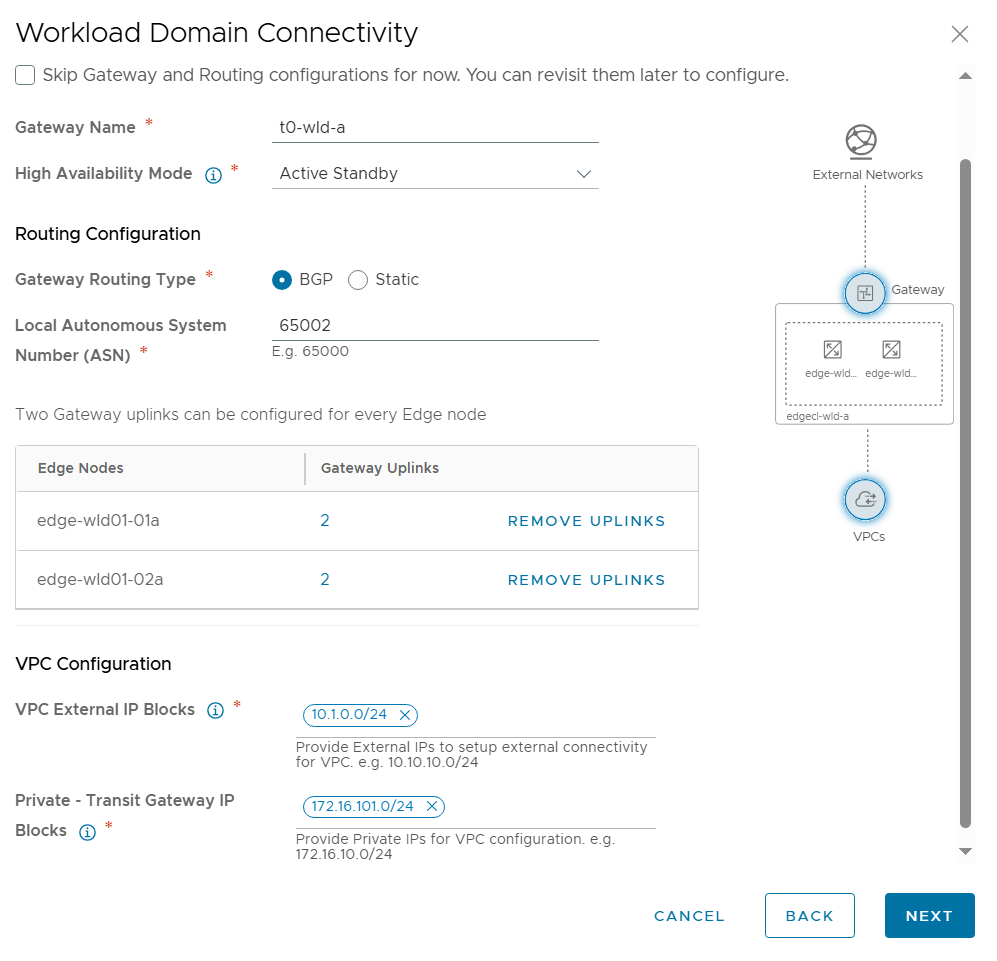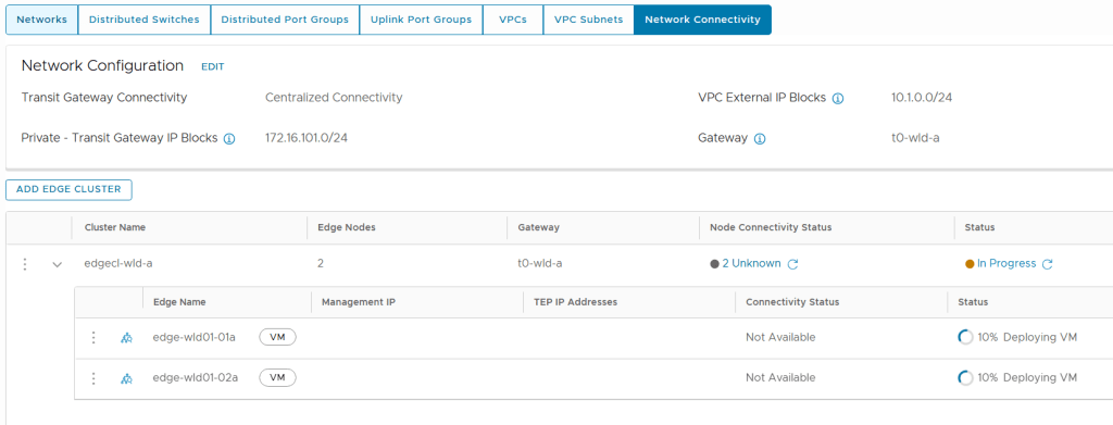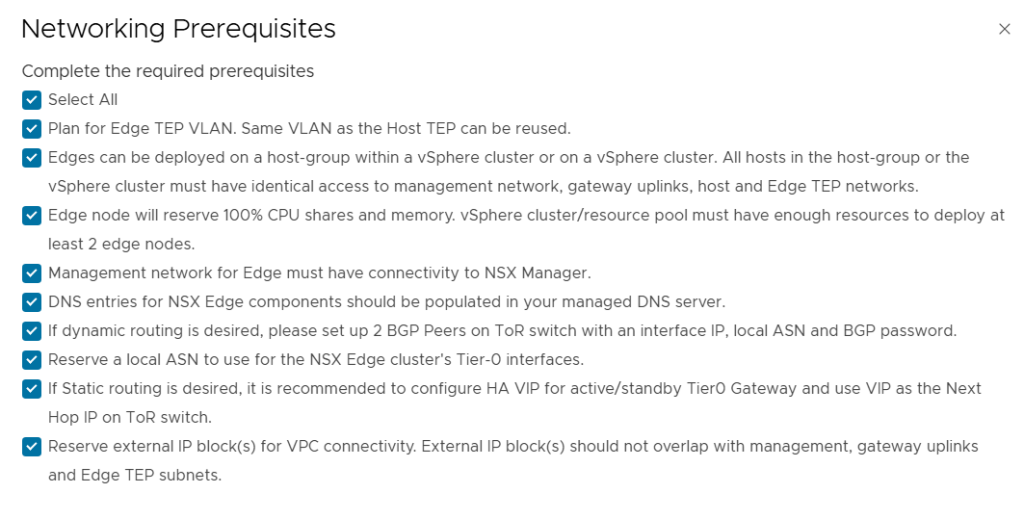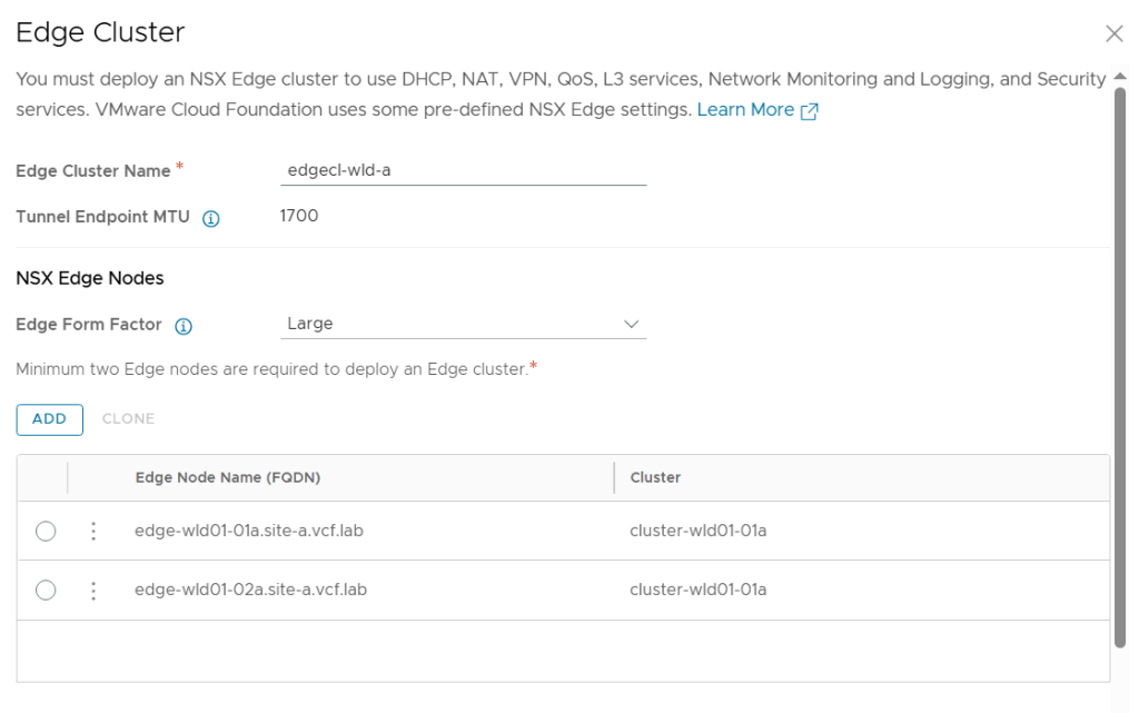 SDDC Manager has a wizard to assist in deploying NSX-T Edge Clusters including the Edge Transport Nodes and the Tier-1 and Tier-0 Gateways required to provide north-south routing and network services. The wizard makes sure you fulfil all the prerequisites, then it will ask you to provide all the required settings like names, MTU values, passwords, IP addresses and so on. This helps you to get a consistent Edge Cluster configuration. Note that VCF is not forcing you to deploy all NSX-T Edge Clusters using this wizard, so please reach out if you want to discuss alternative designs.