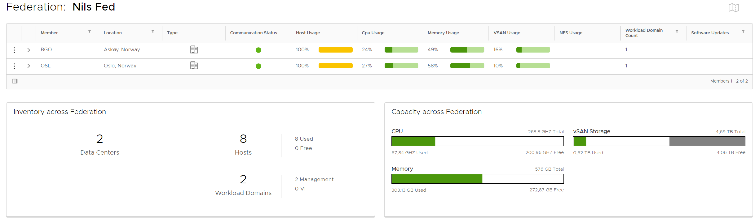 My current VCF lab is running version 4.2 and consist of one Management Workload Domain (WLD) with one Stretched Cluster. That is two Availability Zones with four ESXi hosts in each and a vSAN Witness running in a third independent site. In addition, I have one VI Workload Domain (WLD) containing three ESXi hosts in a non-stretched Cluster. Currently I don’t run vRealize Suite, Tanzu or anything else than what is included in the VCF base-platform. Everything is deployed using VLC.